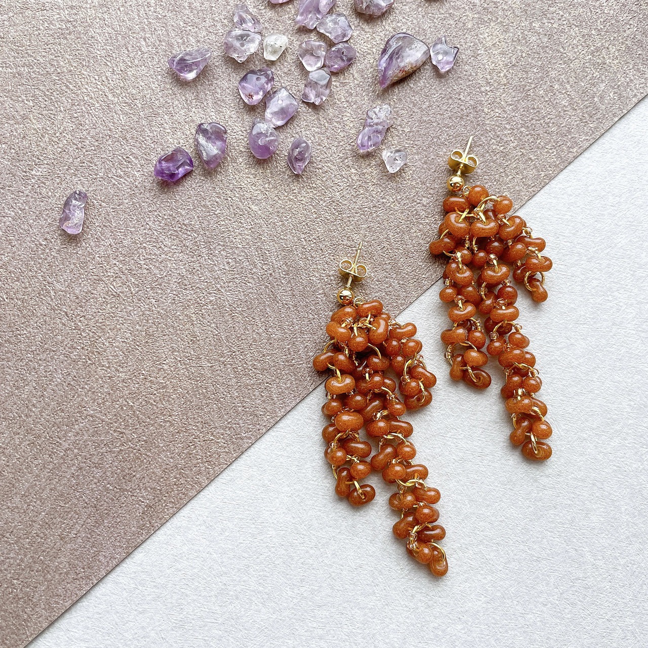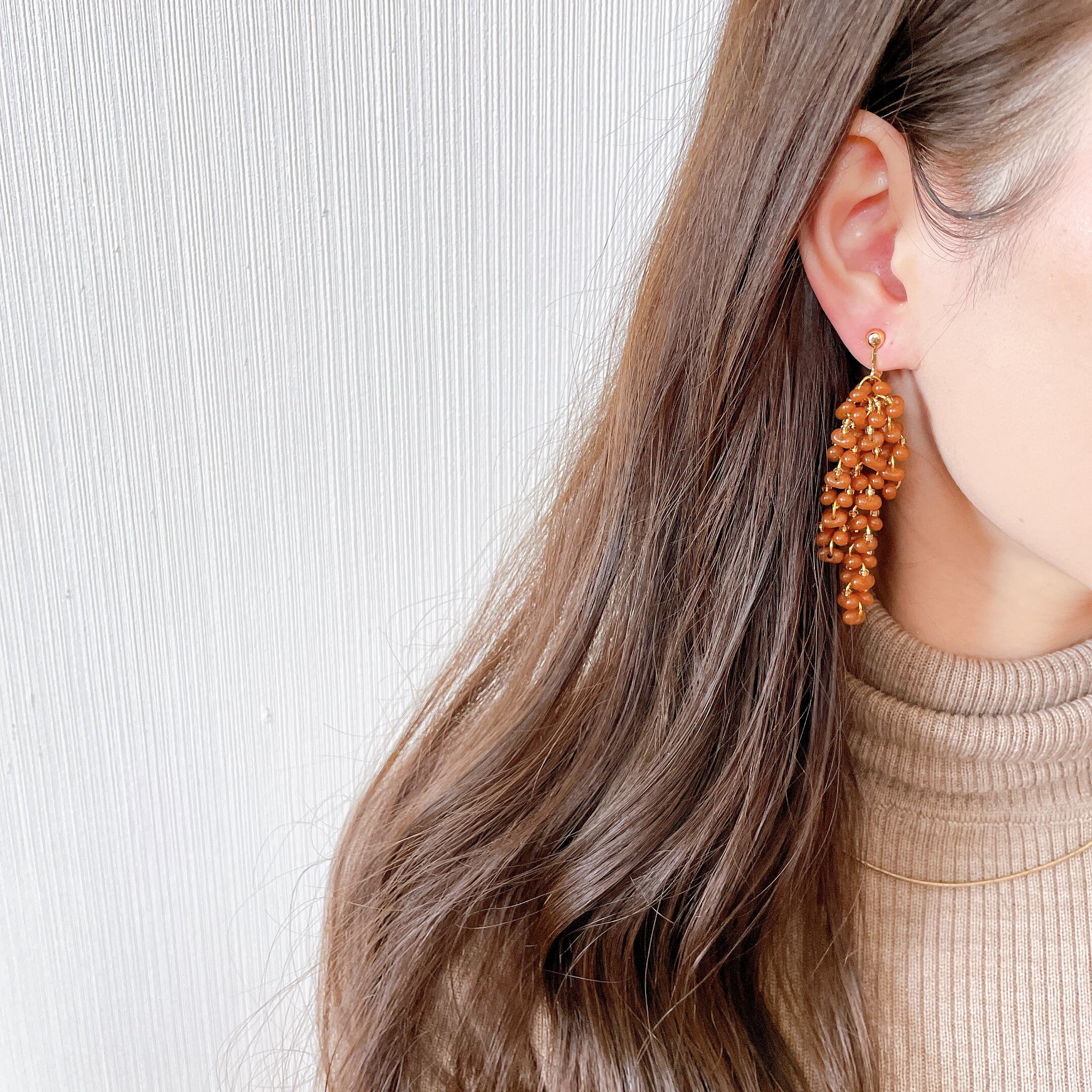 くすみカラーのぷっくりとした小さなガラスビーズと相性の良いオレンジビーズをひとつずつ繋ぎ合わせました。